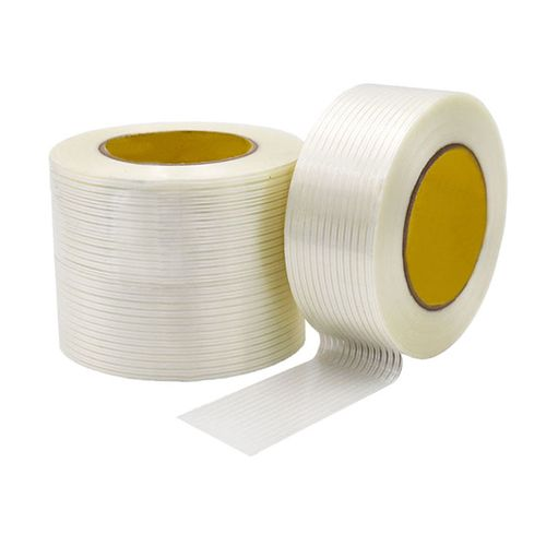 Páska zo sklenených vlákien je tiež bežne známa ako sklenená tkanina bez zásad. Je vyrobený z vysokopevnostnej priadze alebo látky zo sklenených vlákien alebo handričiek ako vystuženého podkladového materiálu kompozitného polyesteru (PET Film) filmu a potiahnutý silným lepidlom priľnavým tlakom na jednej strane. Páska má extrémne vysokú pevnosť napätia, vysokú odolnosť proti opotrebeniu a odpor vlhkosti. Je vhodný na ťažké balenie, zväzok, upevnenie oceľových dosiek a dočasné upevnenie domácich spotrebičov atď. Je to vláknitá páska bez zvyškového lepidla.